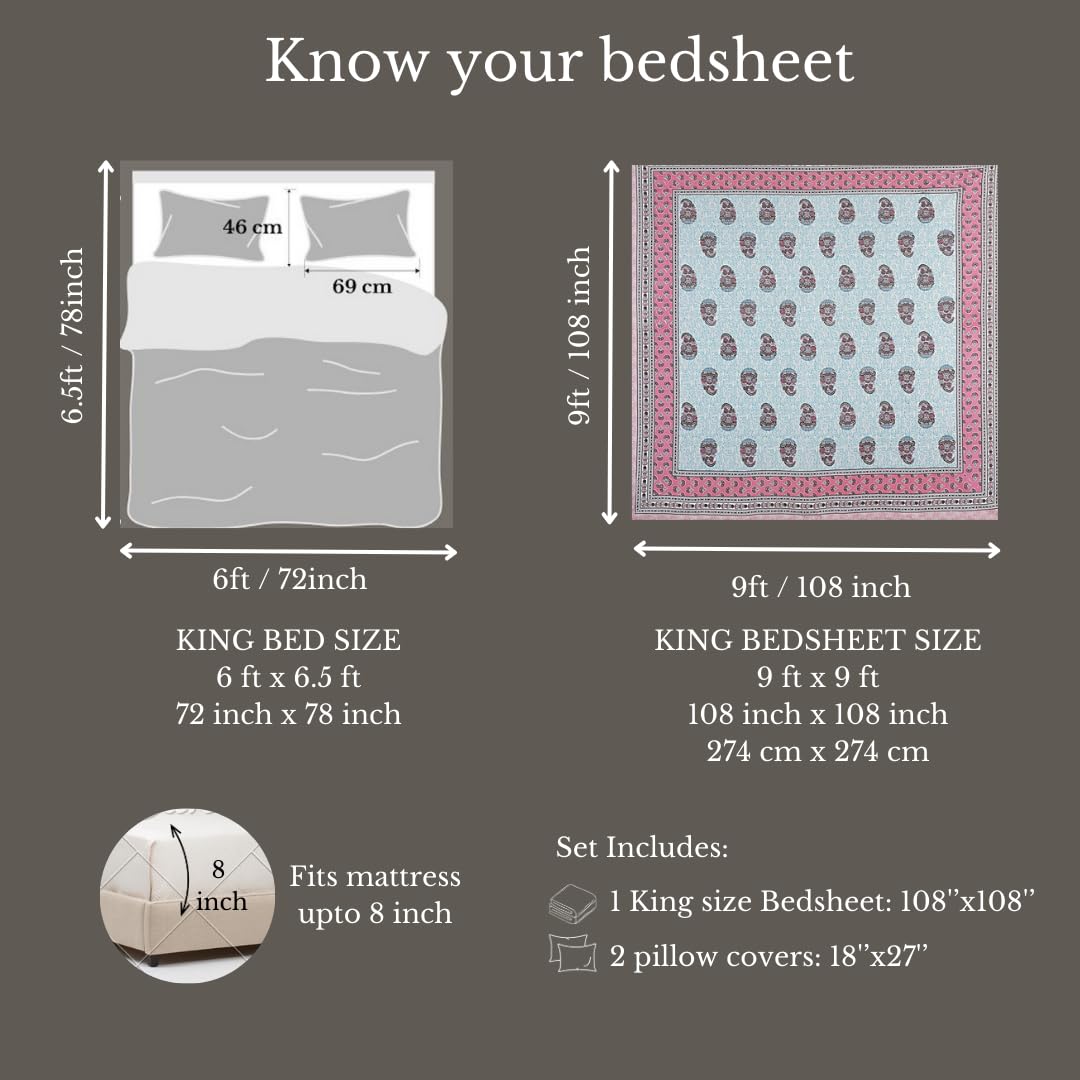 Jaipur Weaves Bedsheet King Size 100% Pure Cotton Bed Sheet with 2 Pillow Covers,144 TC Super Soft Cozy Bedsheets Set, Hand Block Pattern,108×108 inches/ 9ftx9ft (Pink Paisley, Super King)