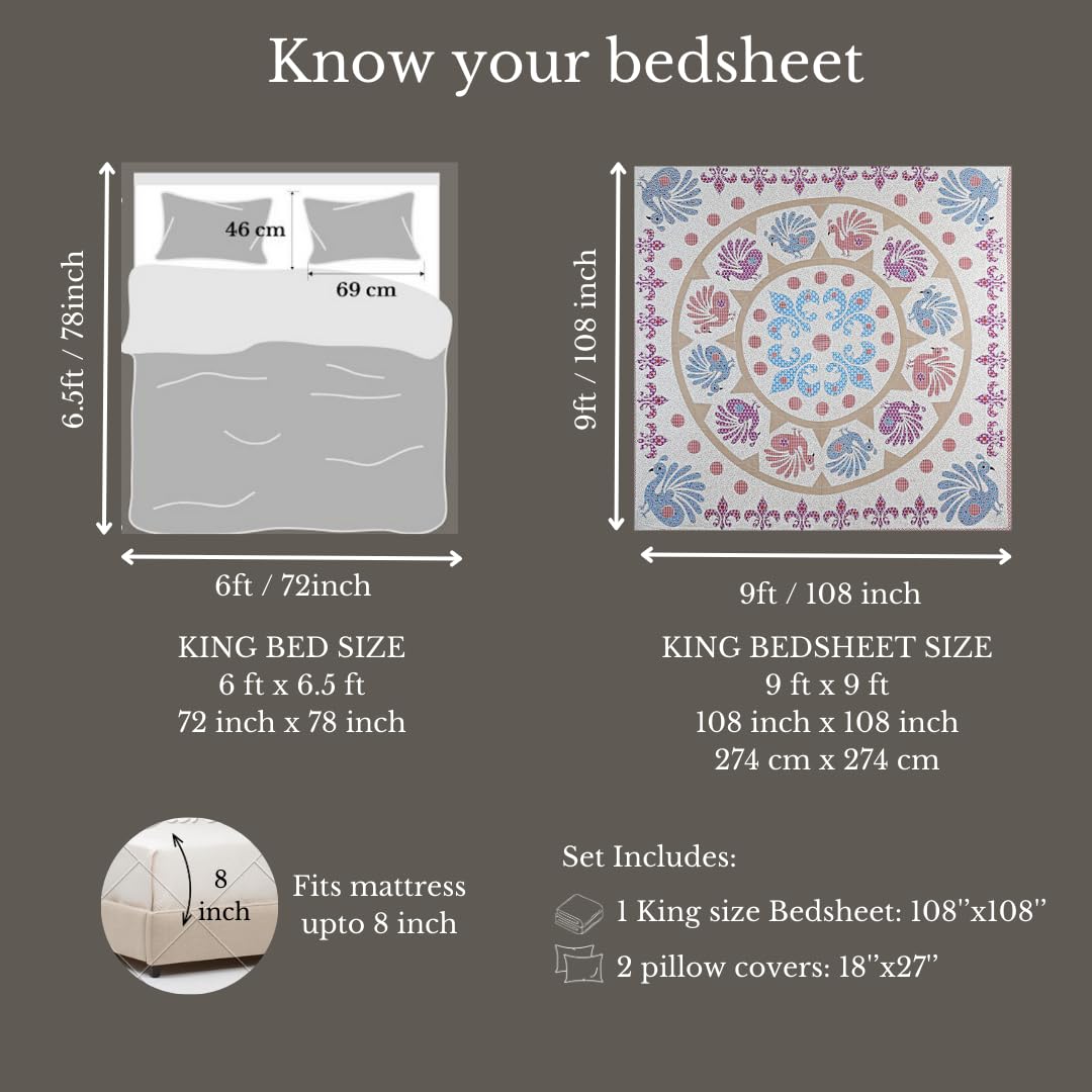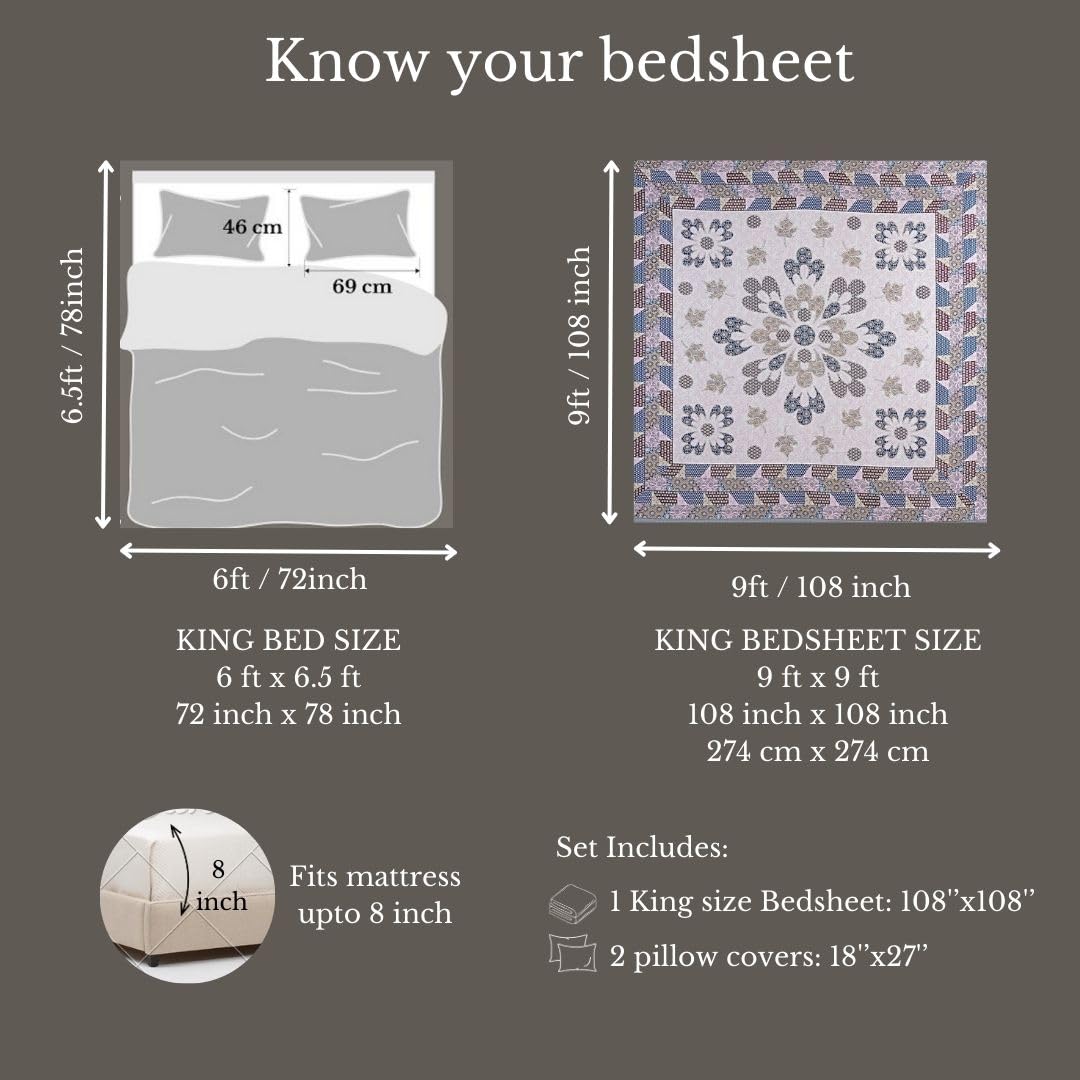 Jaipur Weaves Bedsheet King Size 100% Pure Cotton Bed Sheet with 2 Pillow Covers,144 TC Super Soft Cozy Bedsheets Set,108×108 inches/ 9ftx9ft (Gadh Motif Grey, Super King)