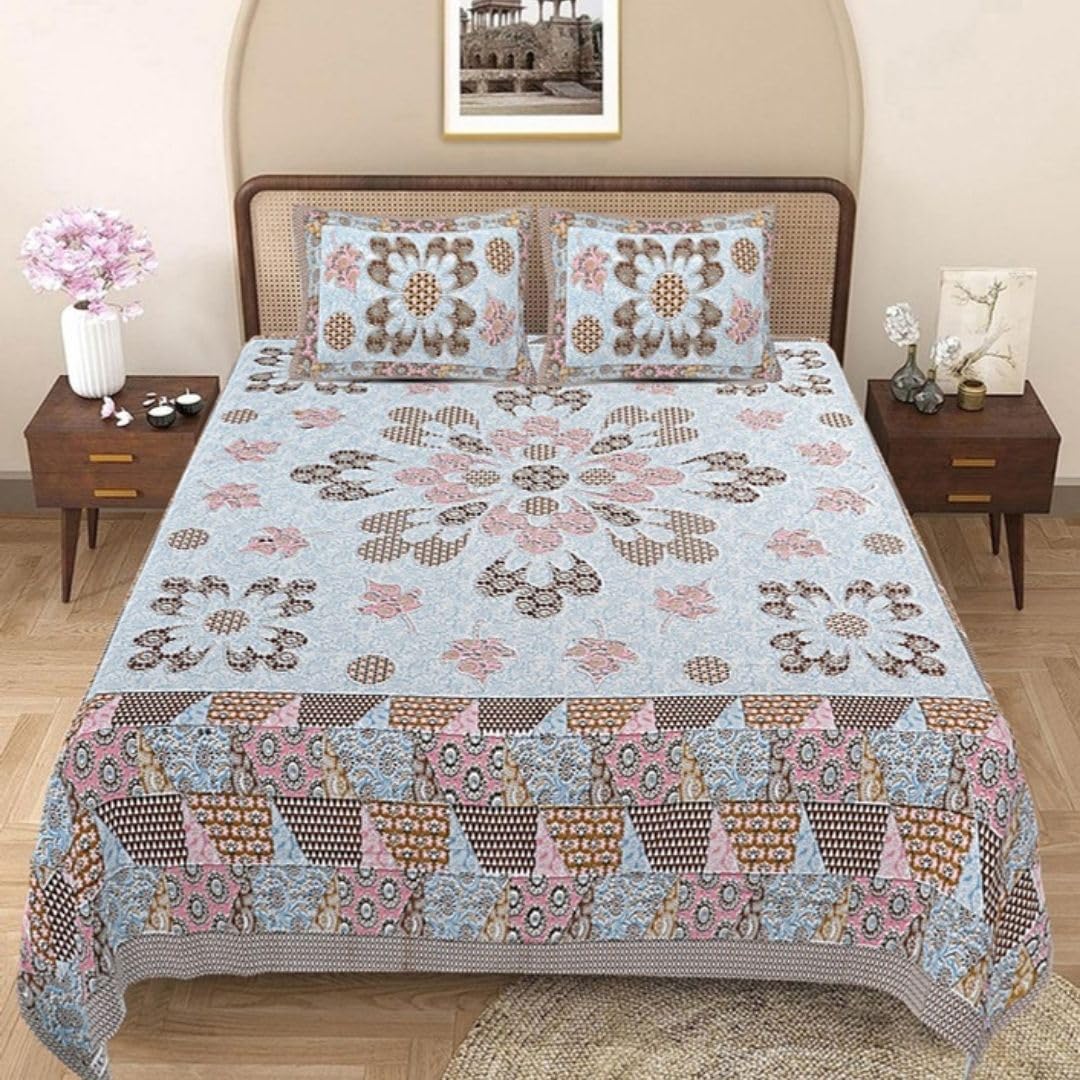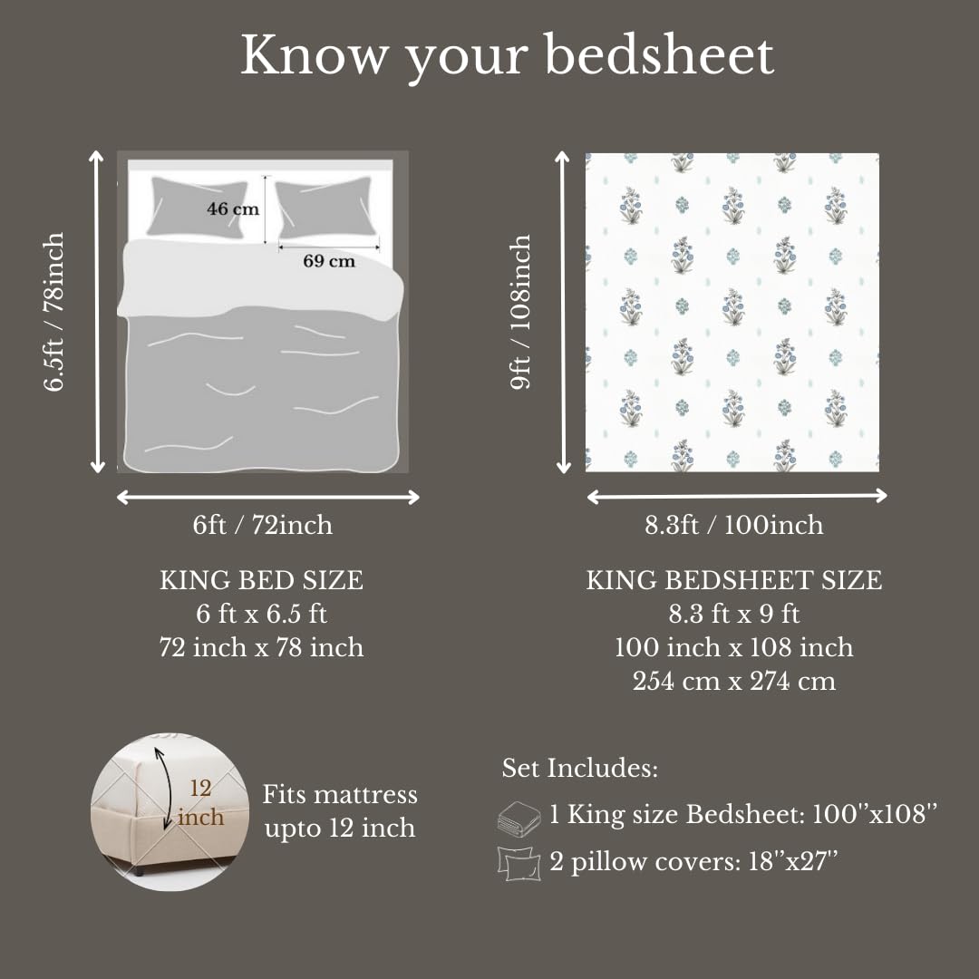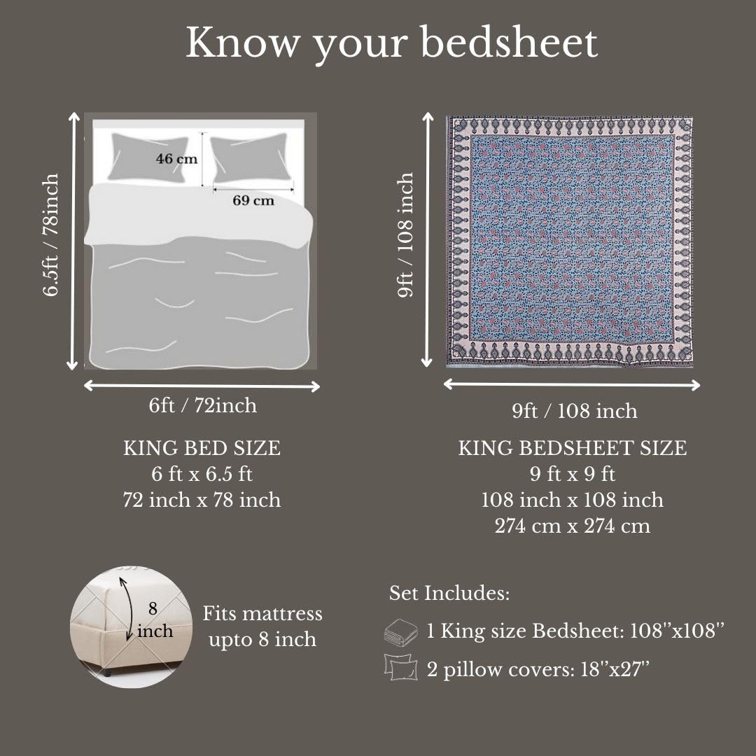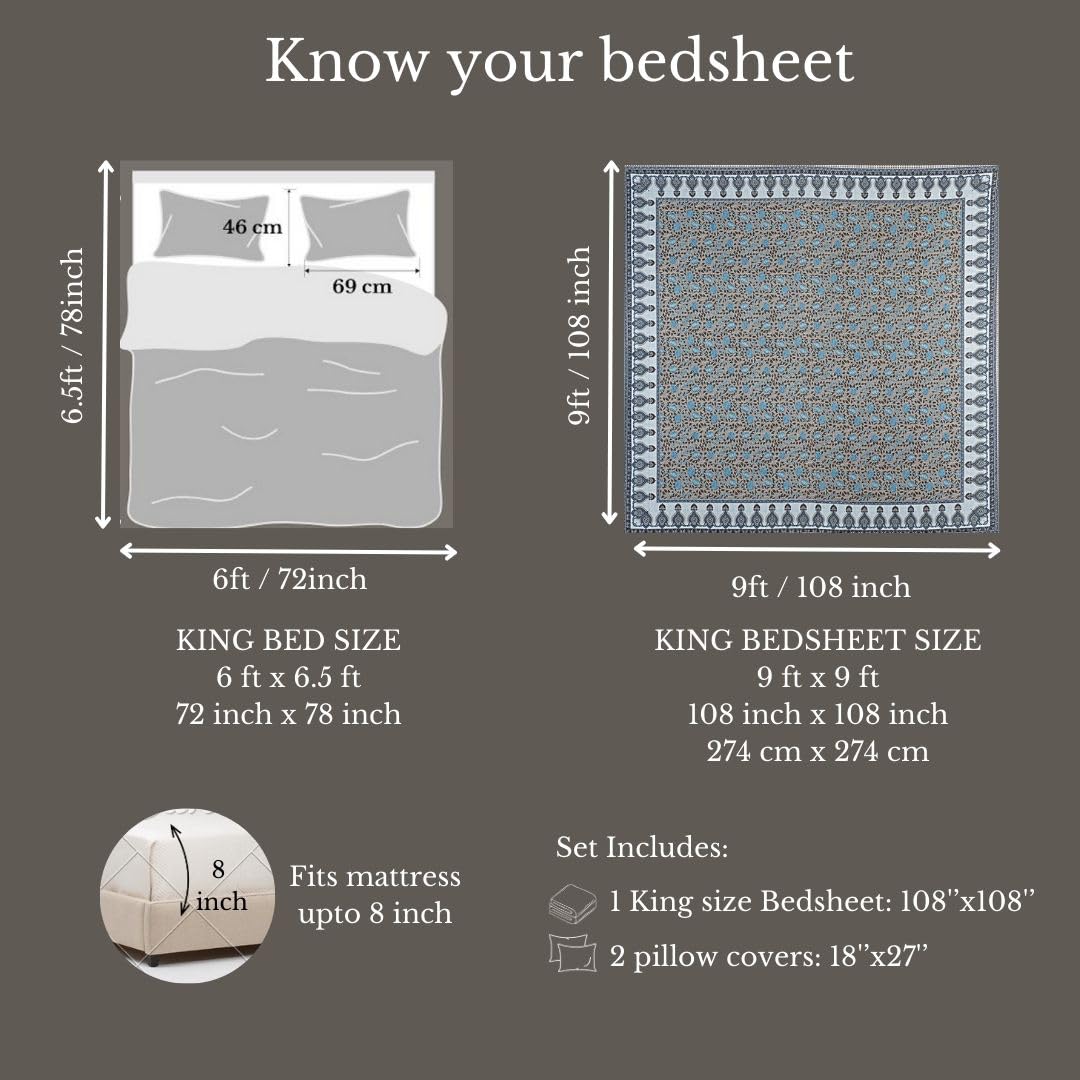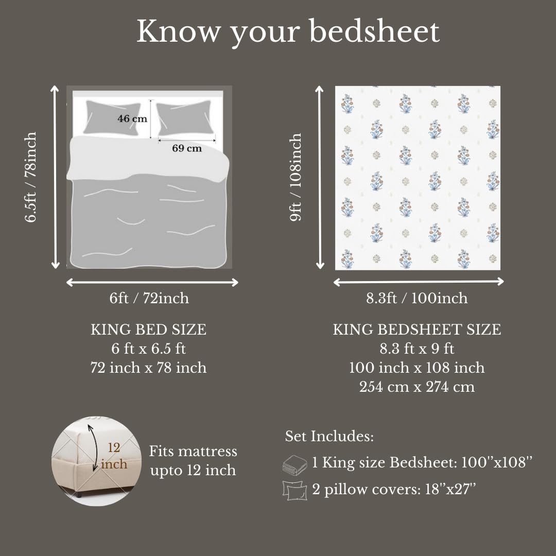 Jaipur Weaves Bedsheet King Size 100% Pure Cotton Bed Sheet with 2 Pillow Covers, 210 TC Premium Bedding Set, Super Soft Cozy (Blue Blocks Meadow, King)