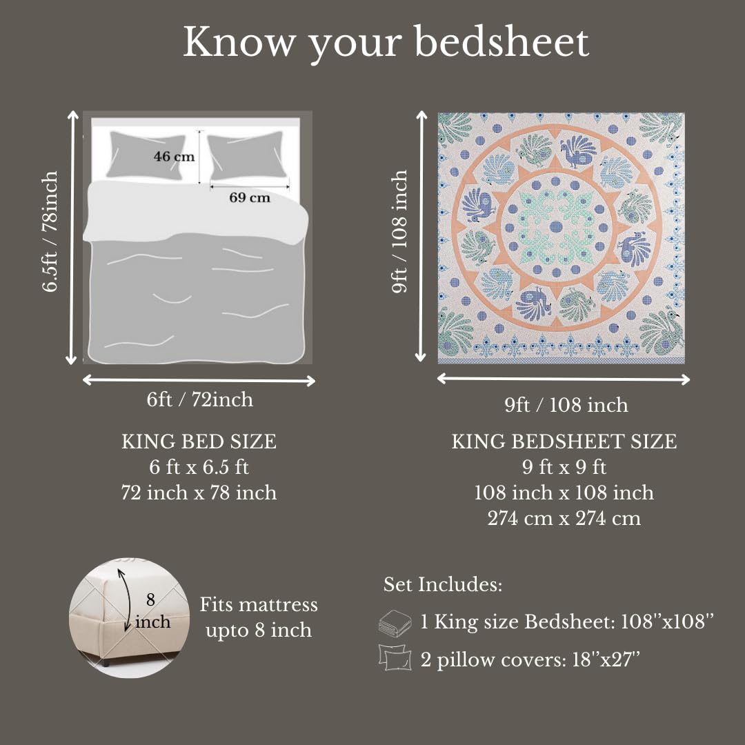 Jaipur Weaves Bedsheet King Size 100% Pure Cotton Bed Sheet with 2 Pillow Covers,144 TC Super Soft Cozy Bedsheets Set,108×108 inches/ 9ftx9ft (Orange Peacock, Super King)