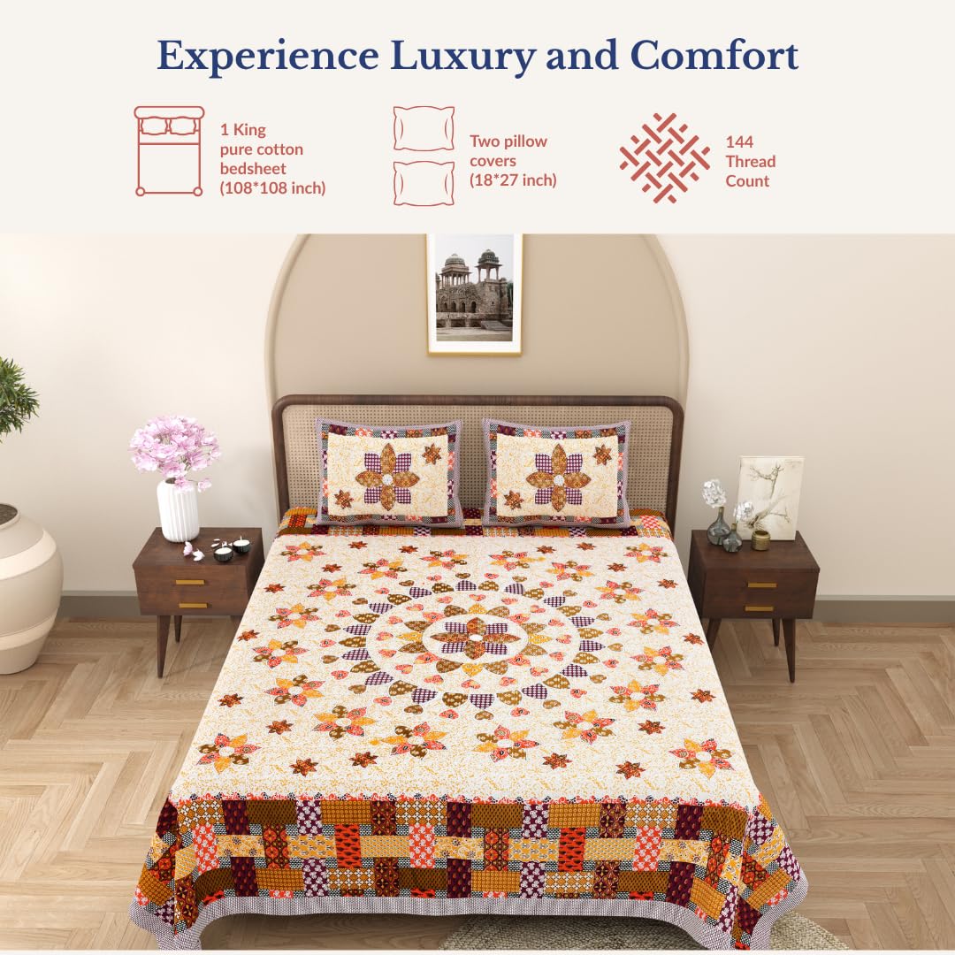 Jaipur Weaves Bedsheet King Size 100% Pure Cotton Bed Sheet with 2 Pillow Covers,144 TC Super Soft Cozy Bedsheets Set,108×108 inches/ 9ftx9ft (Floral Orange, Super King)